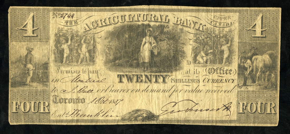 Canada. The Agricultural Bank, Toronto. 4 Dollars. 1837. Ch.20-12-04-06. Milkmaid at upper center, flanked by cherubs, produce below, boy with rake at left, smithy shoeing horse at right. Full frame, strong handwriting. About VF