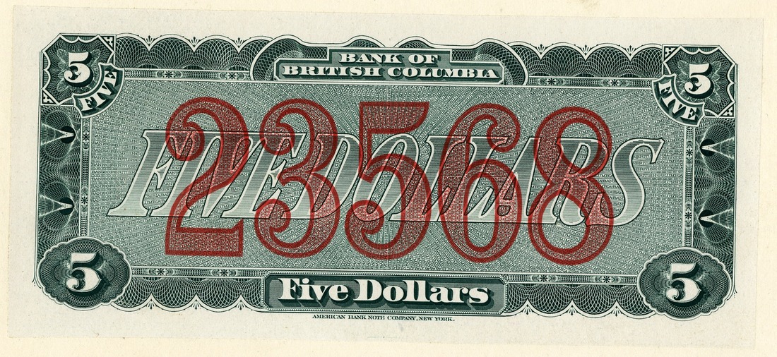 Canada. The Bank of British Columbia. 5 Dollars. 1894. Back Proof. Cf.Ch.50-16-02P. Note printed on 6 x 9" cardstock by the American Bank Note Co. Green with large red ink serial number. Uncirculated, a few minor smudges in the broad white margins of the card, not interfering with back design.