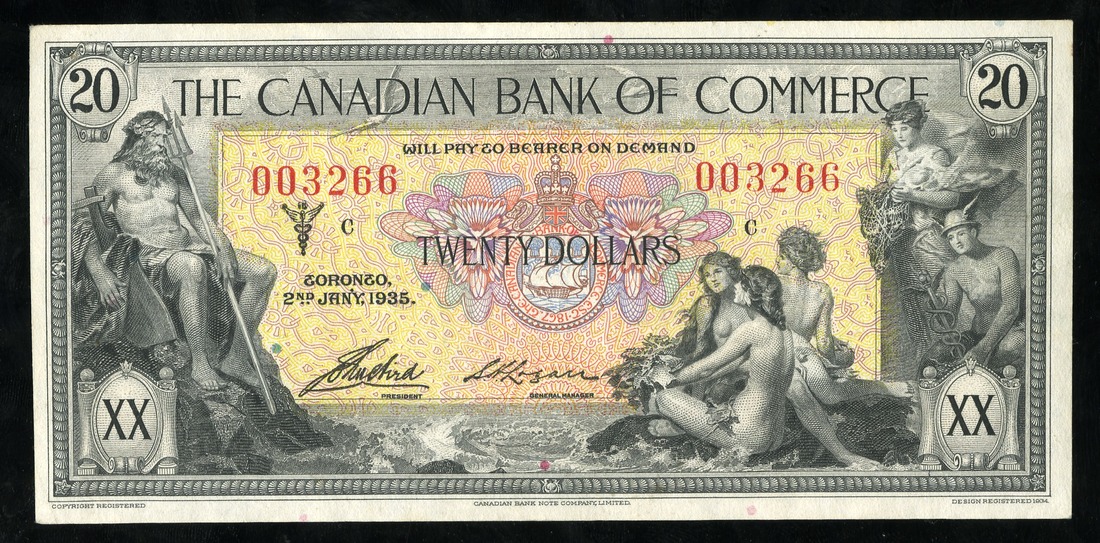 Canada. Canadian Bank of Commerce, Toronto. 20 Dollars. 1935. Ch.75-18-10. No. 003266. Seascape, Neptune seated at left, sea-maidens right center, Mercury and maiden at right; Bank seal flanked by Mercury and Ceres on back. One of the most beautiful designs on Canadian banknotes. Choice Uncirculated, a superlative example.