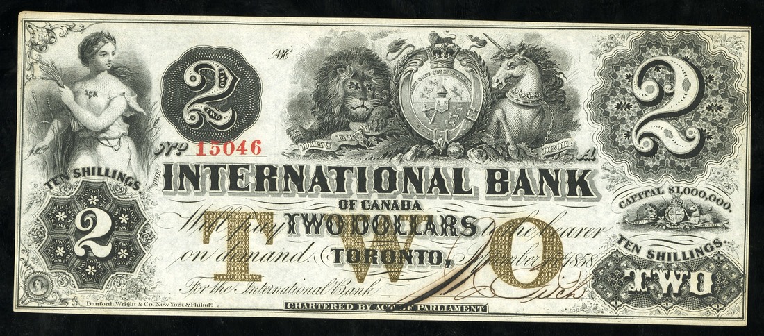 Canada. International Bank, Toronto. 2 Dollars. 1858. Ch.380-10-08-12. No. 15046 in red. Lovely gold "TWO" underprint, brown protectors. Arms supported by lion and unicorn, young maiden at left. Produced by Danforth, Wright & Co., NY. Minor ink burn in signature. AU-Uncirculated.