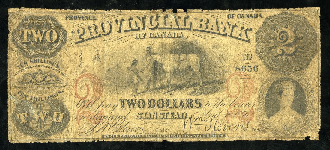 Canada. The Provincial Bank of Canada, Stanstead. 2 Dollars (10 Shillings). Ch.610-10-04. Indian warrior holding horse, boy feeding it, at upper center, Chalon portrait of Queen Victoria lower right. Good-VG. These notes are seldom offered and are usually only found in low grade.