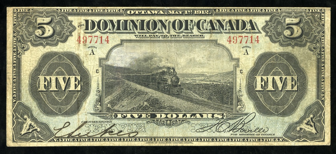 Canada. Dominion of Canada. 5 Dollars. 1912. Ch-DC-21a. No seal, Boville signature. Series A. No. 497714. Black with blue tint, Intercolonial Railway passenger train Ocean Limited traveling through the Wentworth Valley in Nova Scotia at center. A highly sought-after note. Fine-VF, two tiny pinholes noted.