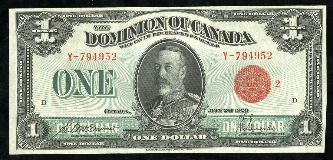 Canada. Dominion of Canada. 1 Dollar. 1923. Ch-DC-25g. No. Y-794952. McCavour-Saunders signatures. Red seal. About Uncirculated and very crisp.