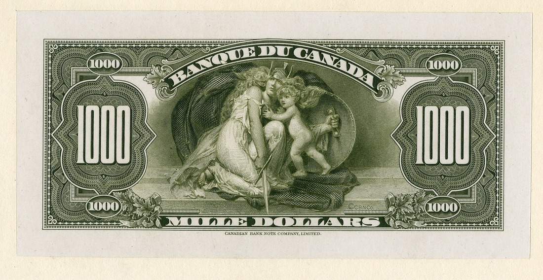 Canada. Bank of Canada. 1000 Dollars. 1935 French series. Back Proof. Ch-BC-20BP. Olive green, Security allegory - woman shielding her child, at center. Note printed on 6 x 9" cardstock by the Canadian Bank Note Company, Limited. Very attractive. Uncirculated.
