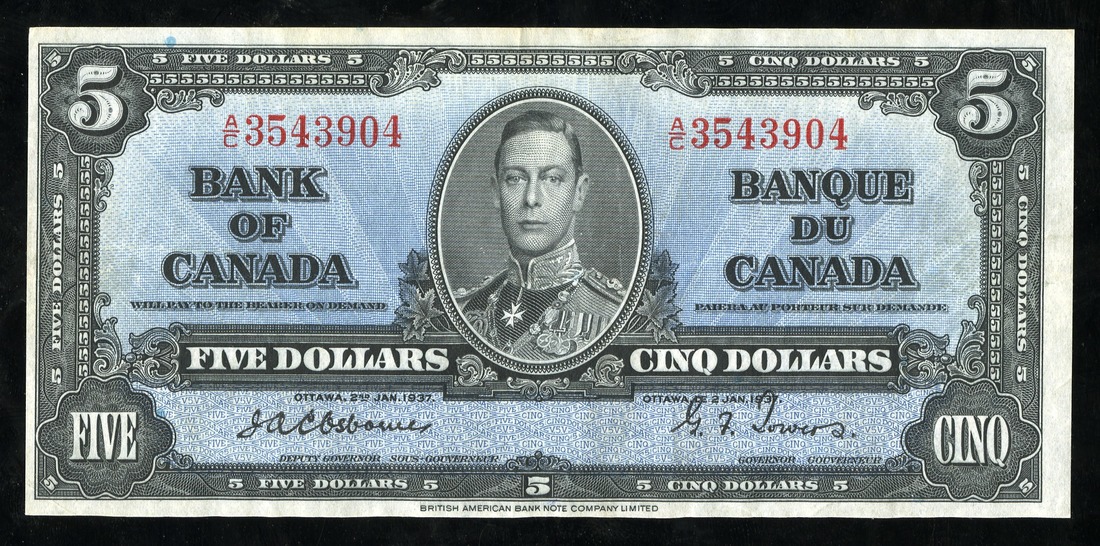 Canada. Bank of Canada. 5 Dollars. 1937. Ch-BC-23a. Scarce Osborne (Osborne-Towers) signature. No. AC3543904. Black with blue tint, portrait of George V at center; allegory of Electrical Power on back. Popular signature. Minor fold in middle. Good EF, with the appearance of a Crisp AU.