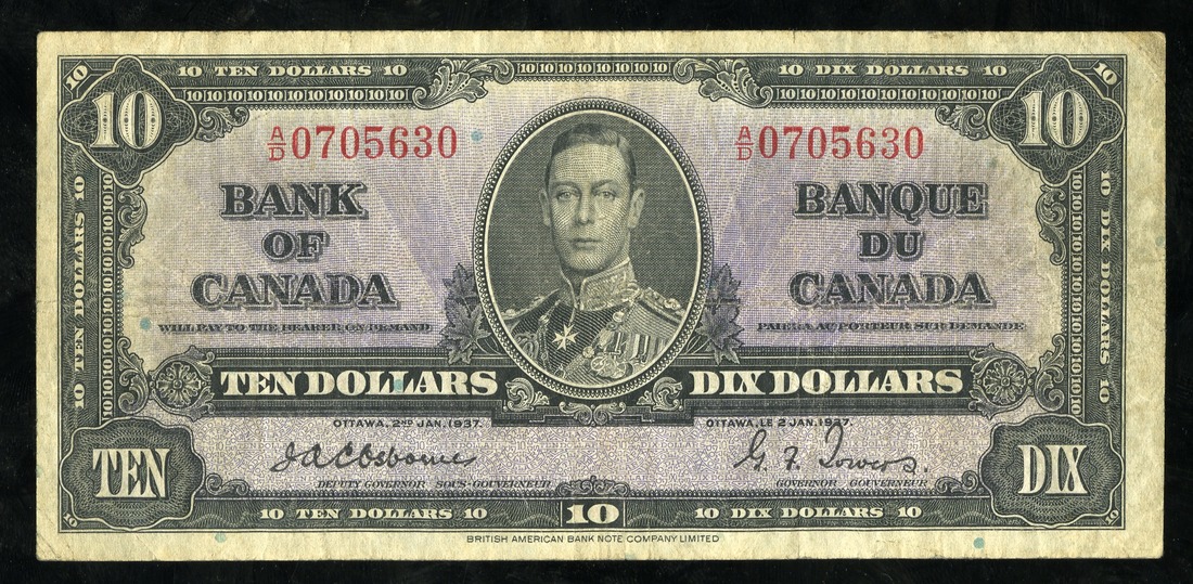 Canada. Bank of Canada. 10 Dollars. 1937. Ch-BC24a. Scarce Osborne (Osborne-Towers) signature. No. AD0705630. Black with purple tint, George V portrait at center; Mercury standing facing on back amid forms of transport. A well-sought after note. Very moderate soiling on back. Very Fine