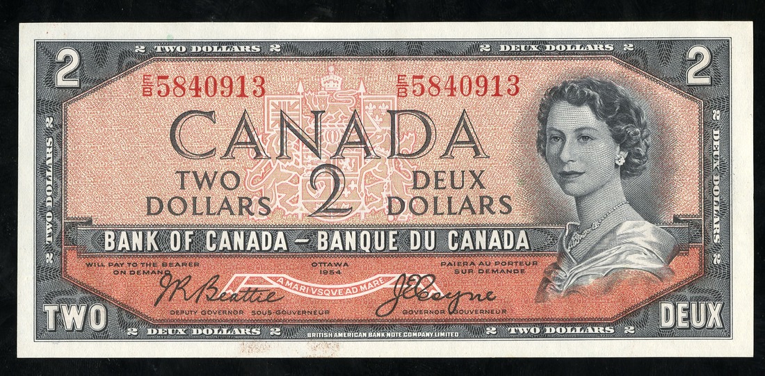 Canada. Bank of Canada. Variety pair of 2 Dollars. 1954. "Devil's Face" Portrait and Star replacement note. Ch-BC-30b, 38bA. The latter with trivial red ink residue in left margin. Both Uncirculated. [2]