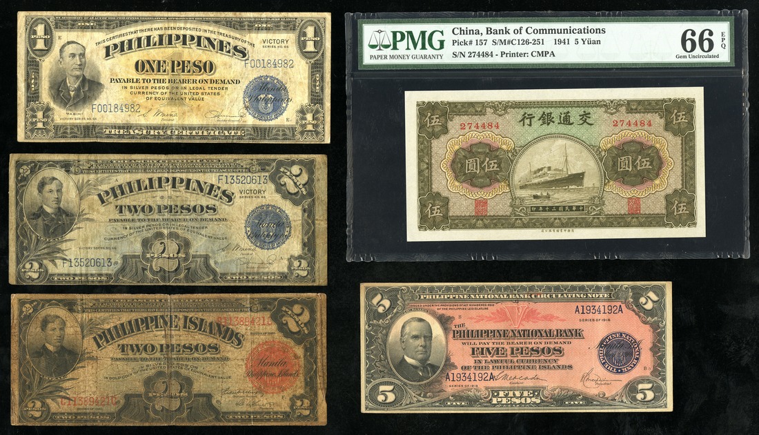 China. Bank of Communications. 5 Yuan. 1941. P-157. Ship at center. PMG Gem Uncirculated 66 EPQ; also: Philippines notes (4), 1916-1944. VG-VF. [5]