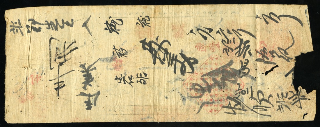 China. Private Bank issue. Wan Heng Bank. 2 Dollars. 1842. Blue, red blocks and black ink calligraphy. Rare. F-VF, small body hole and missing piece at bottom.