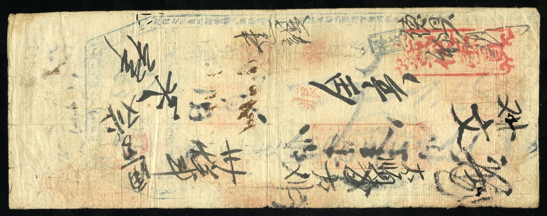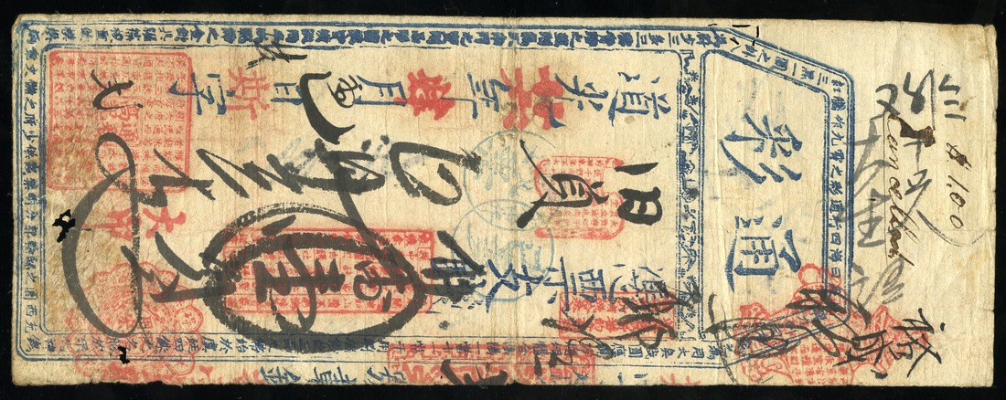 China. Private Bank issue. Tong Cai Bank. 1 Dollar. 1847. Blue, red blocks and black ink calligraphy. Rare. Very Fine, a few small body holes.