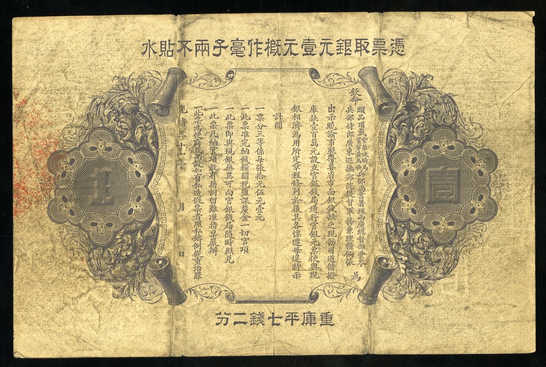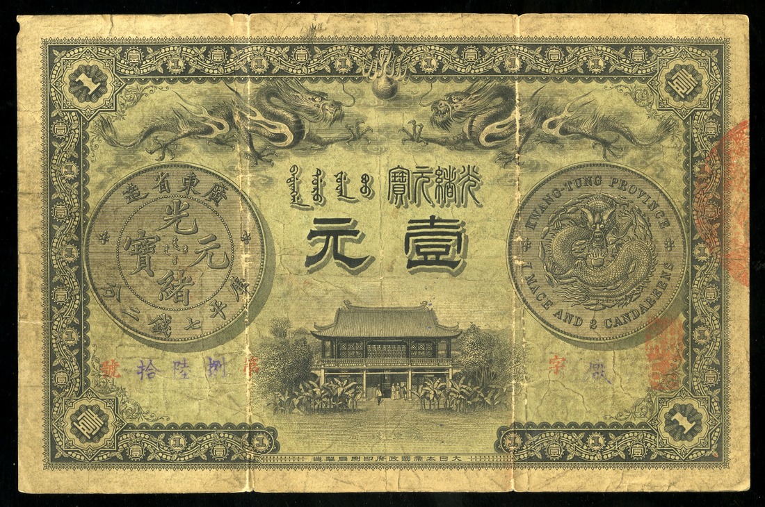 China. Kwangtung Currency Board. 1 Dollar. 1905. P-S2388. Obverse and reverse of Kwangtung Silver Dollar left and right, dragons above, building below. Very Good.
