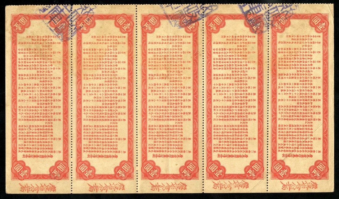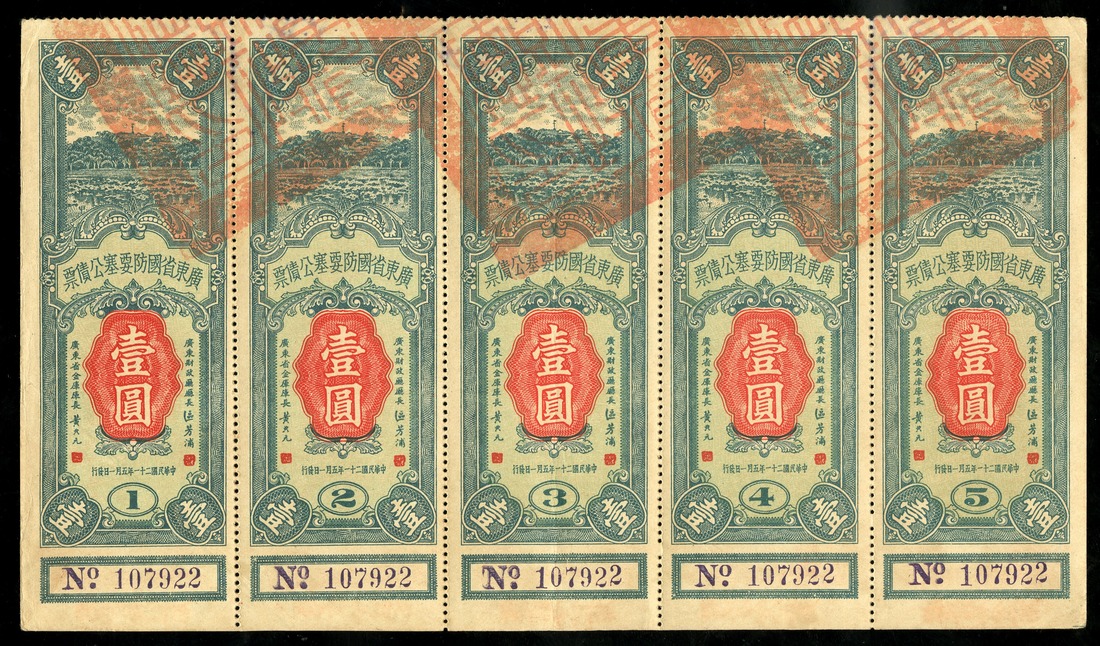 China. Pair of Kwangtung Military Scrip. 1 Dollar. 1932. P-NL. Nos. 107922 and 148633. Two uncut panes of five perforated notes. Green with red guilloche, orange-red backs. Hilltop at upper center of each, engraved numbers 1-10 bottom center. Choice Extremely Fine. [2]