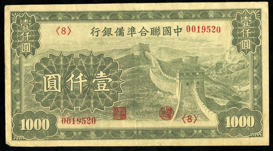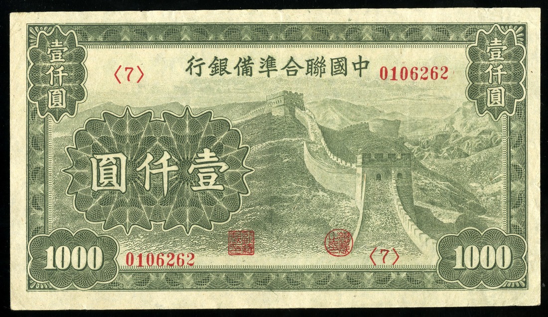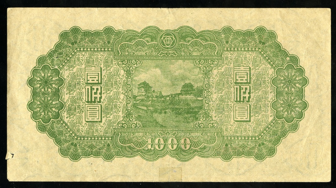 China. Japanese Puppet Bank. Federal Reserve Bank of China. Quintet of 1000 Yüan. ND (1945). P-J91. Dark green. Great Wall at center right; Ch'ien Men fortress center back. All VF or better, one with paper clip stains. [5]