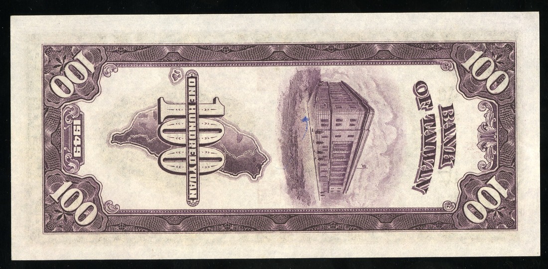 China. Taiwan. Bank of Taiwan. 100 Yüan. 1949. P-1957. Brown-violet with brown-violet guilloche. Sun Yat-sen portrait upper center, bank building on back. Rare. Crisp Uncirculated.