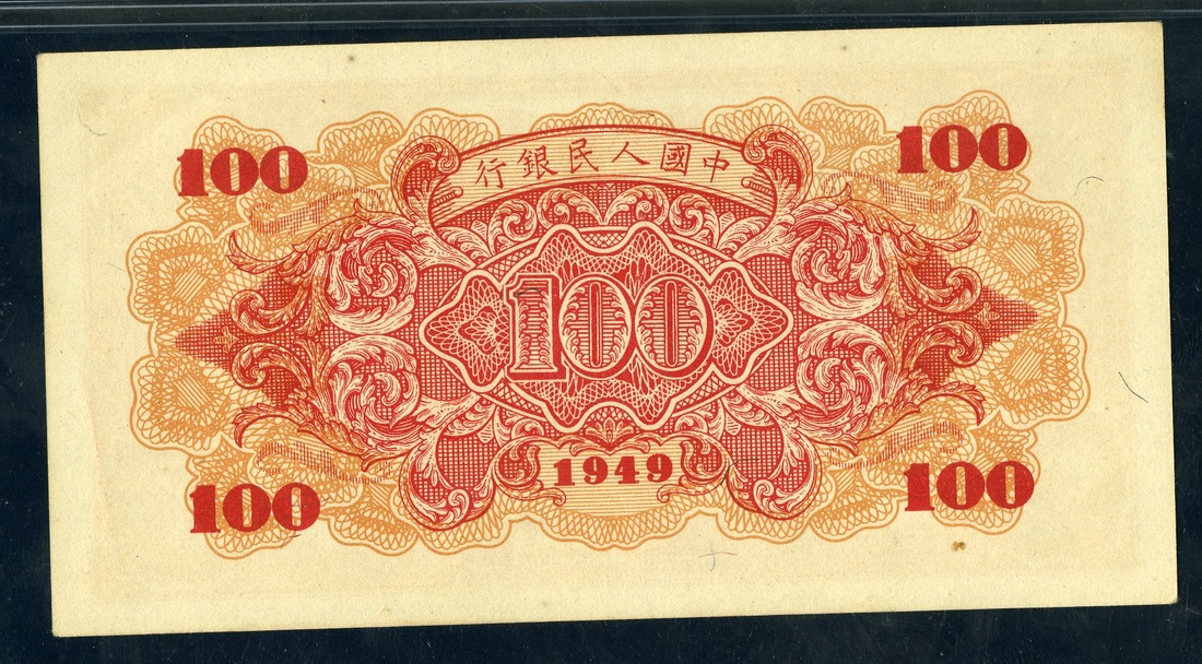 China. Peoples Republic. Peoples Bank of China. 100 Yuan. 1949. P-831. No. 49724166. Red on orange underprint, brown and red guilloche. Ship dockside. PMG About Uncirculated 55.