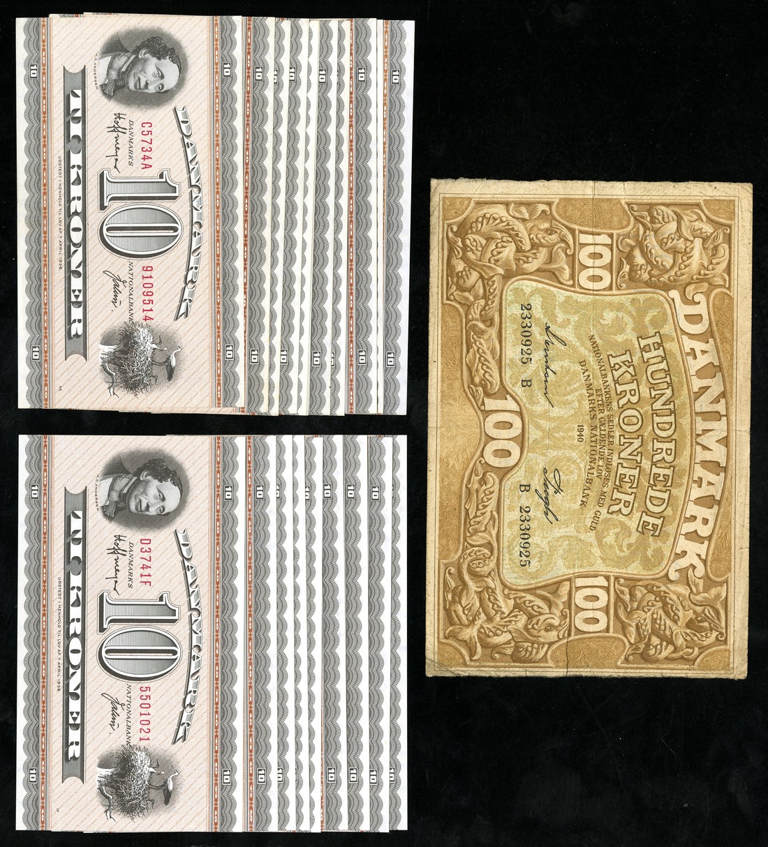 Denmark. Danmarks Nationalbank. 10 Kroner lot. 1964, 1969, 1973 (9), 1974 (9 - consecutive numbers). P-44s, y, ac, ae. Iconic Hans Christian Anderson and storks in nest vignettes, Windmill on back. Two AU, otherwise, Crisp Uncirculated; also 100 Kroner, 1940. P-33b. Dolphin borders, Mermen support Arms on back. About Fine [21]