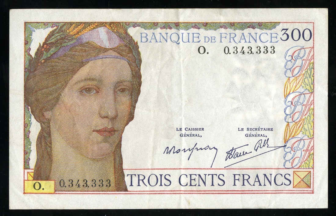 France. Banque du France. 300 Francs. ND (1938). P-87a. Head of Ceres at left, Mercury head at right on back. Very Fine, two trivial pinholes, warm, vibrant color.