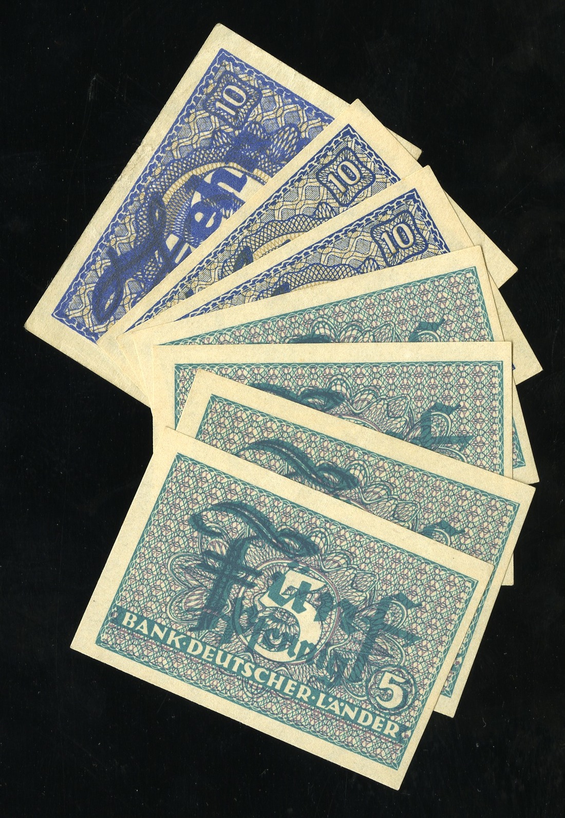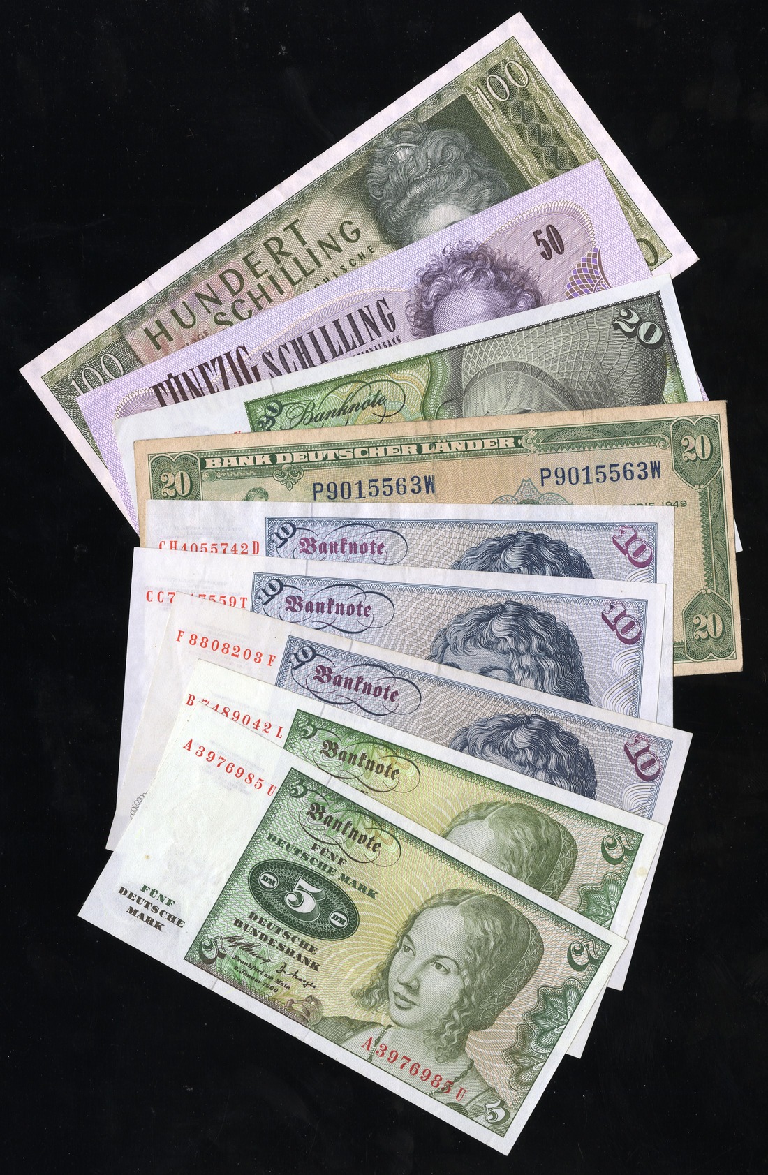 Germany. Small group of notes: Bank Deutscher Länder. 5 Pfennig (4), 10 Pfennig (3). ND (1948) P-11, 12. One of the 10 Pfennigs Fine, the rest Unc.; 20 Deutsche Mark. 1949. P-17a. Allegorical figures at left. F-VF; Federal Republic. Deutsche Bundesbank. 5 Deutsche Mark (2), 10 Deutsche Mark (3), 20 Deutsche Mark. The last AU, the others VF or so; also Austria. 50 Schilling. (1972). P-143; and 100 Schilling. (1981). P-146. Unc and EF-AU. [15]