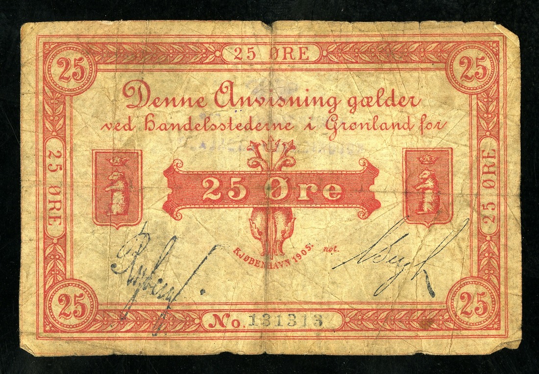 Greenland. Handelsstederne I Grønland. 25 Øre. 1905. P-4. No. 131313. Polar bear Arms flank value on central cartouche. Stamped in purple ink on back: (Crown) ADMINISTRATIONEN FOR KOLONIERNEN GRØNLAND. Rare. Heavy center fold, nick upper center. Very Good.