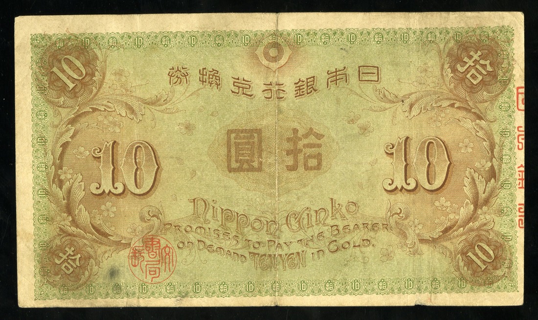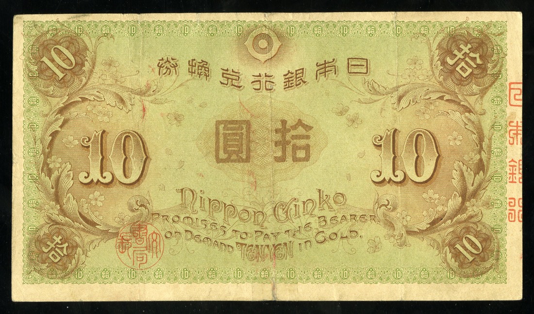 Japan. Bank of Japan. Convertible Gold Note issue. Trio of 10 Yen. ND (1915). P-36. Portrait of the Nara Period official Wakeno Kiyomaro at left, shrine lower right. One About Fine with a few tiny split holes at center; the other two Fine-VF. [3]
