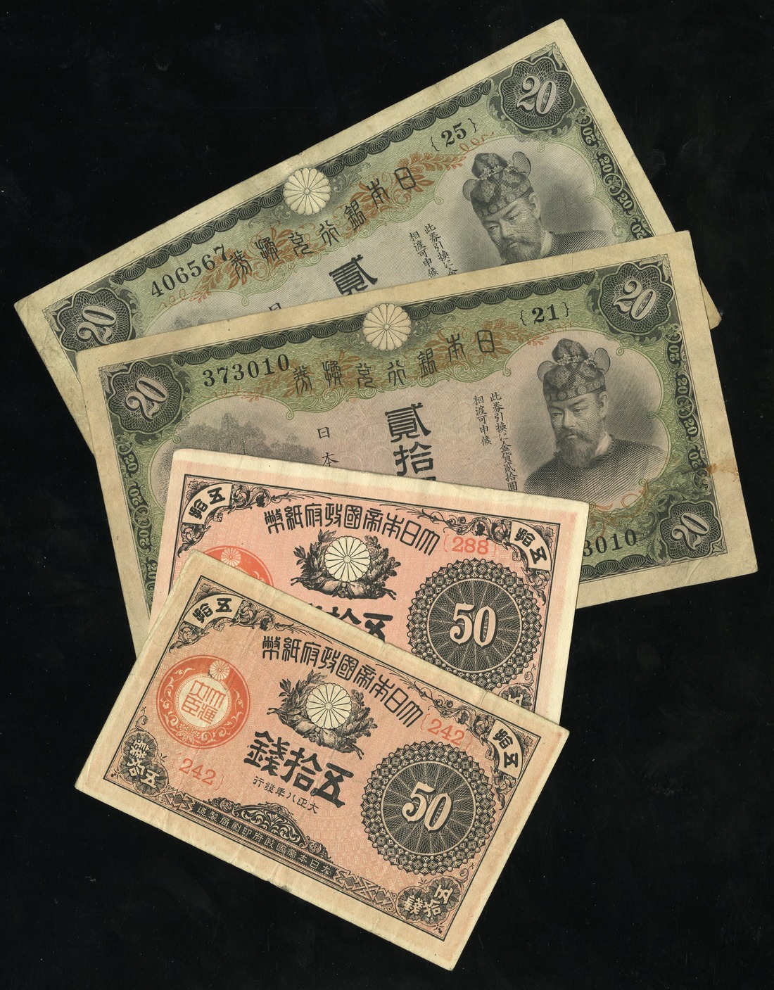Japan. Bank of Japan. Pair of 20 Yen. ND (1931). P-41a. Fujiwara Kamatari portrait at right, Danzan Shrine left, Shrine again on back. Fine and F-VF with slight stain in margin; and Great Imperial Japanese Government. 50 Sen. Taisho year 8 and 9. P-48b, c. Fine and EF. [4]