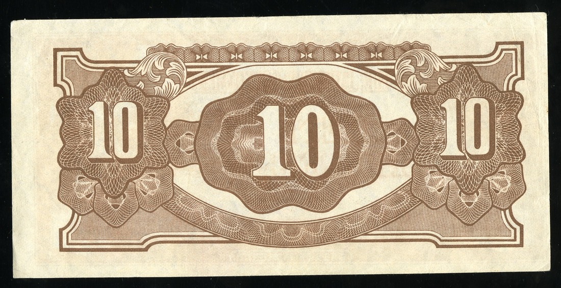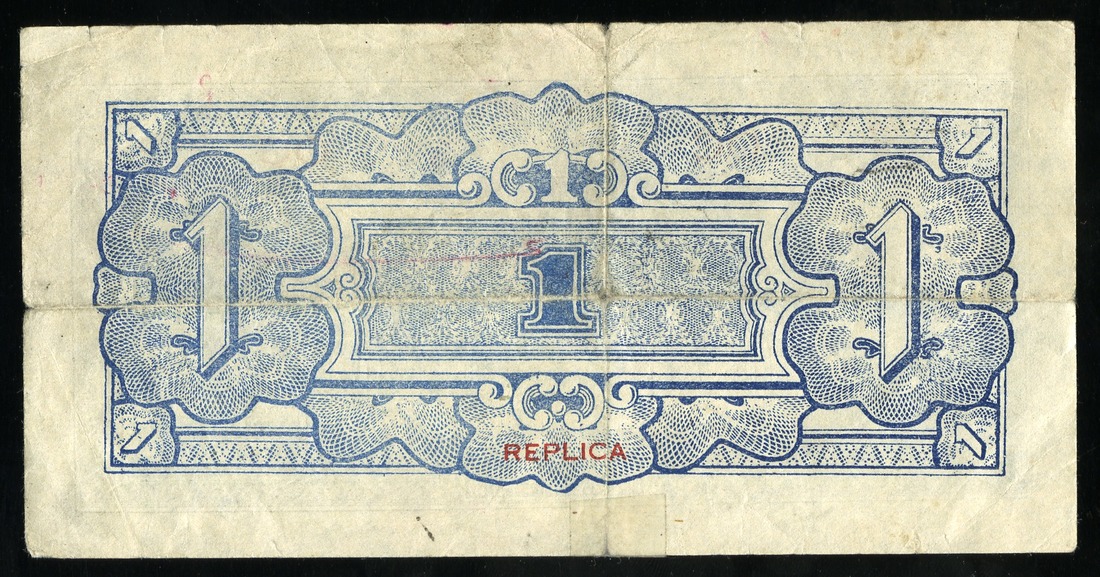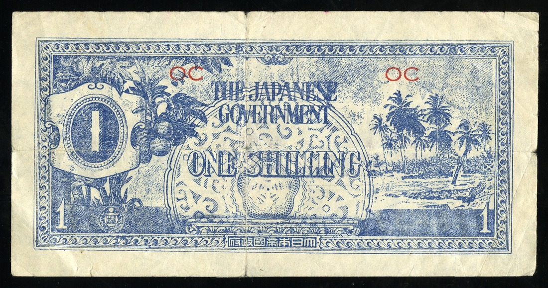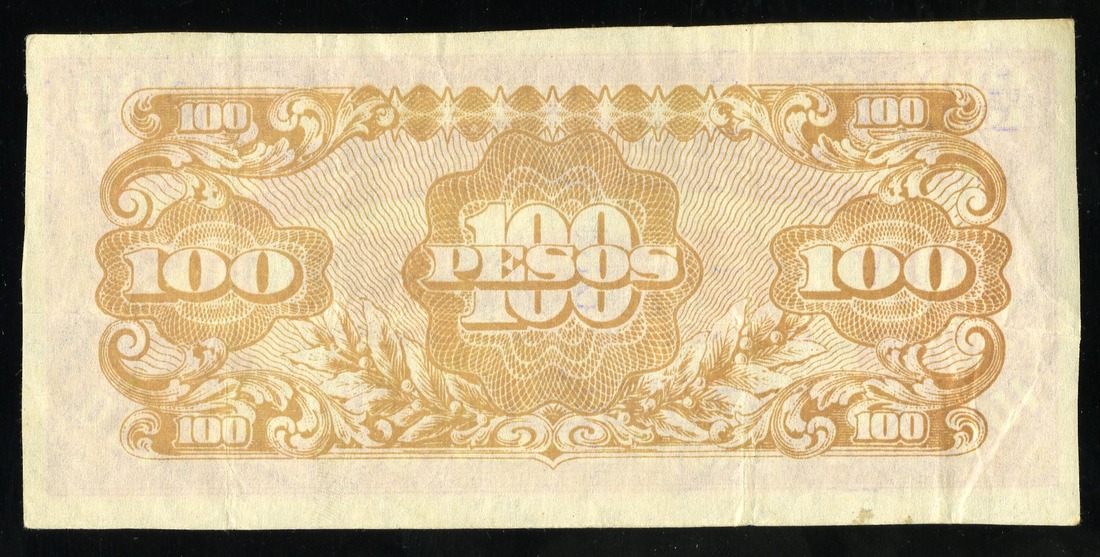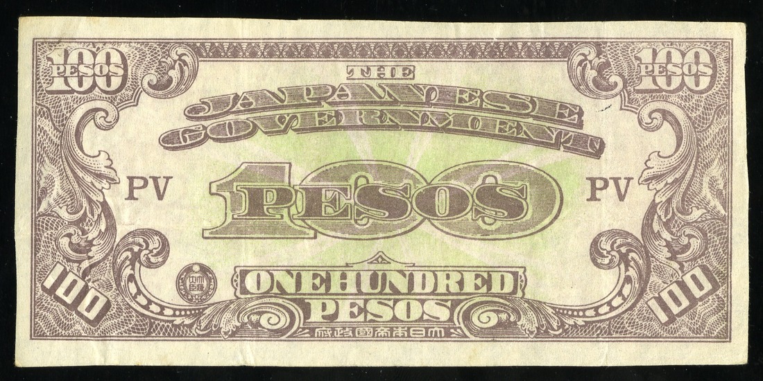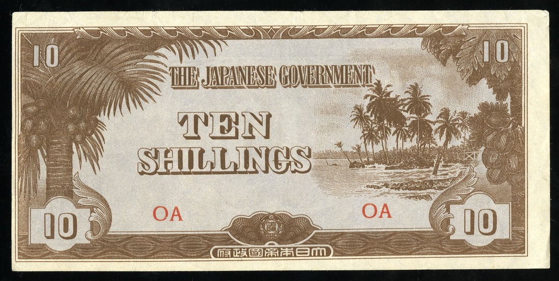 Japan. Trio of better Invasion/Occupation Currency: for the Philippines. 100 Pesos. SB.2231, P-113Brown, light green center; back yellow-brown. Very Rare. F-VF; for British Oceania. 10 Shillings. SB.2214. Palm-tree dotted coast, palm tree at left. VF-EF; Souvenir-Replica One Shilling. SB.2217a. Bright blue, "REPLICA" on back and block letters in red. VF, minor edge split. [3]
