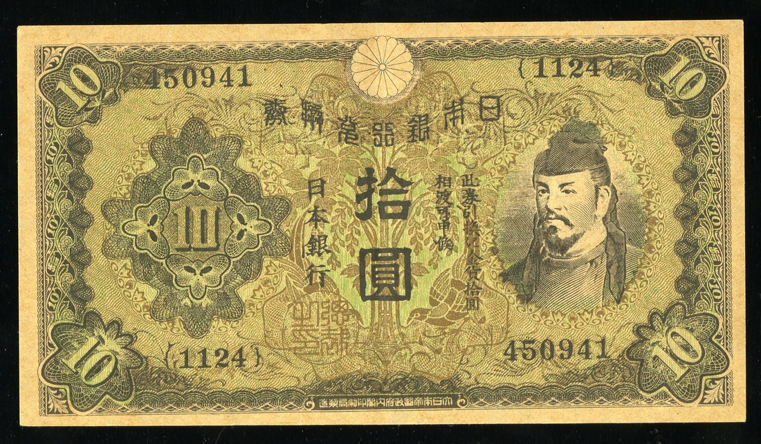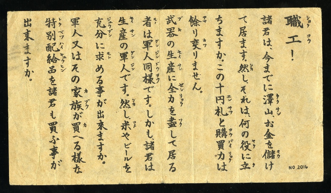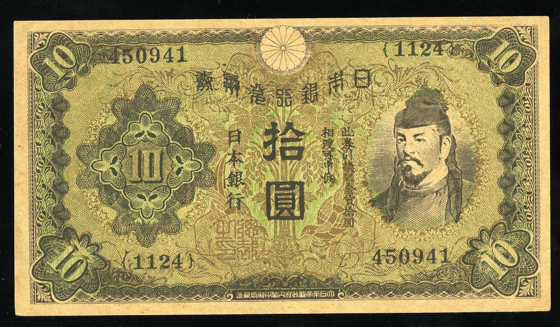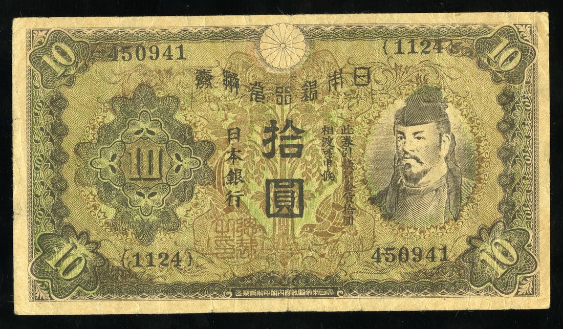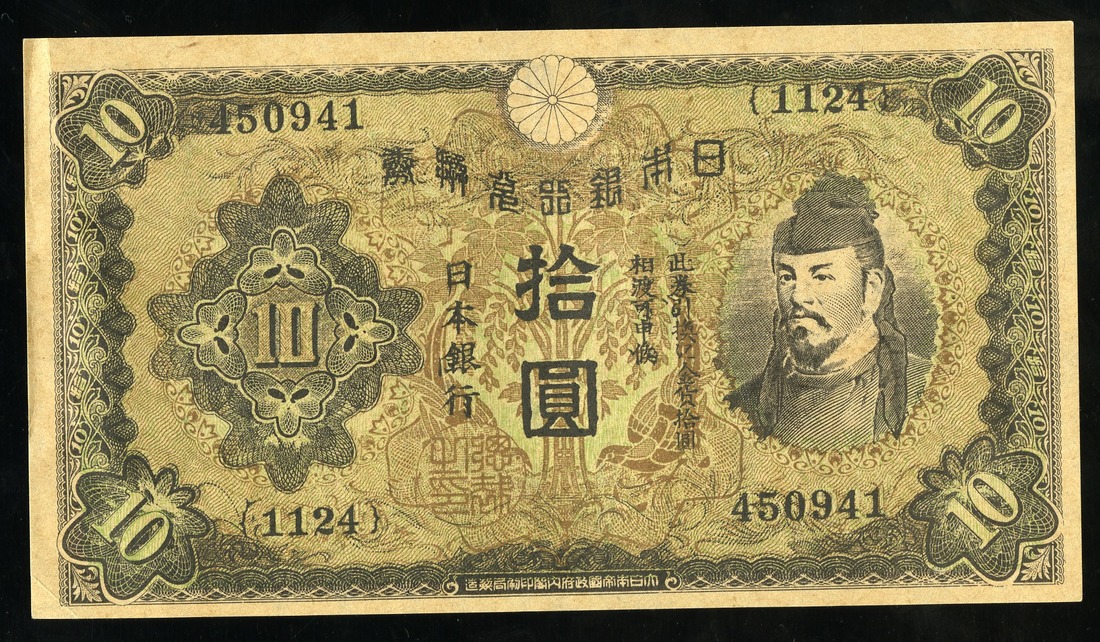 Japan. WWII. Complete Set of U.S. Propaganda (1945) Reprints of 1930 10 Yen notes. Leaflet #2009, 2016, 2017 and 2034. "Y5,000. With this money, pay your land taxes…"; "Factory Workers…"; "To the Japanese people…"; "Before the military clique started the war…". SB. 169-172. AU, VF, AU and Unc. [4]