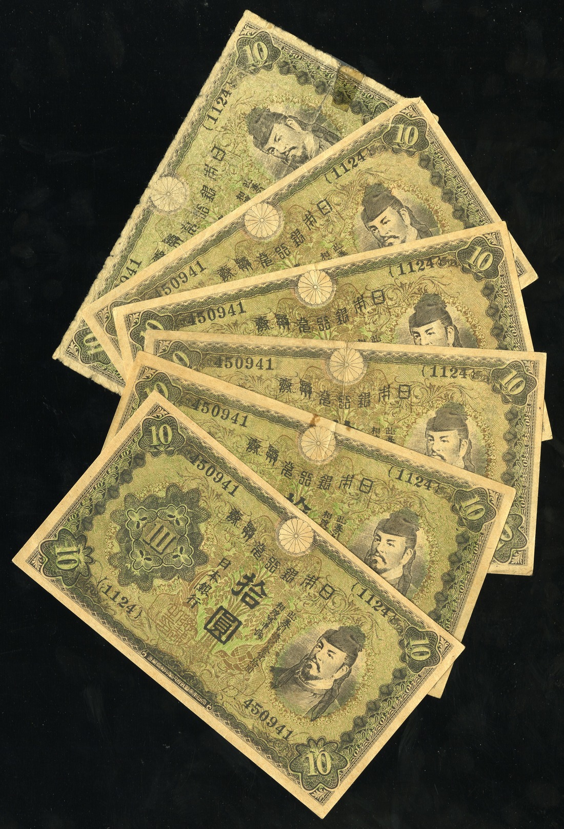 Japan. WWII. Sextet of U.S. Propaganda (1945) Reprints of 1930 10 Yen notes. Leaflets 2016 (3), 2034 (3). "Factory Workers! Until now, you workers earned a great deal of money. But what use is it to you..."; "Before the military clique started the war, the following commodities could be bought with Y10 in Showa 5…" SB. 170, 172. The first three: VF, EF and AU; the latter About Fine with tape remnant, EF and AU. [6]