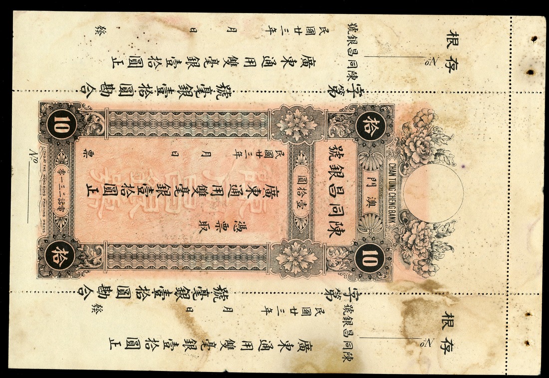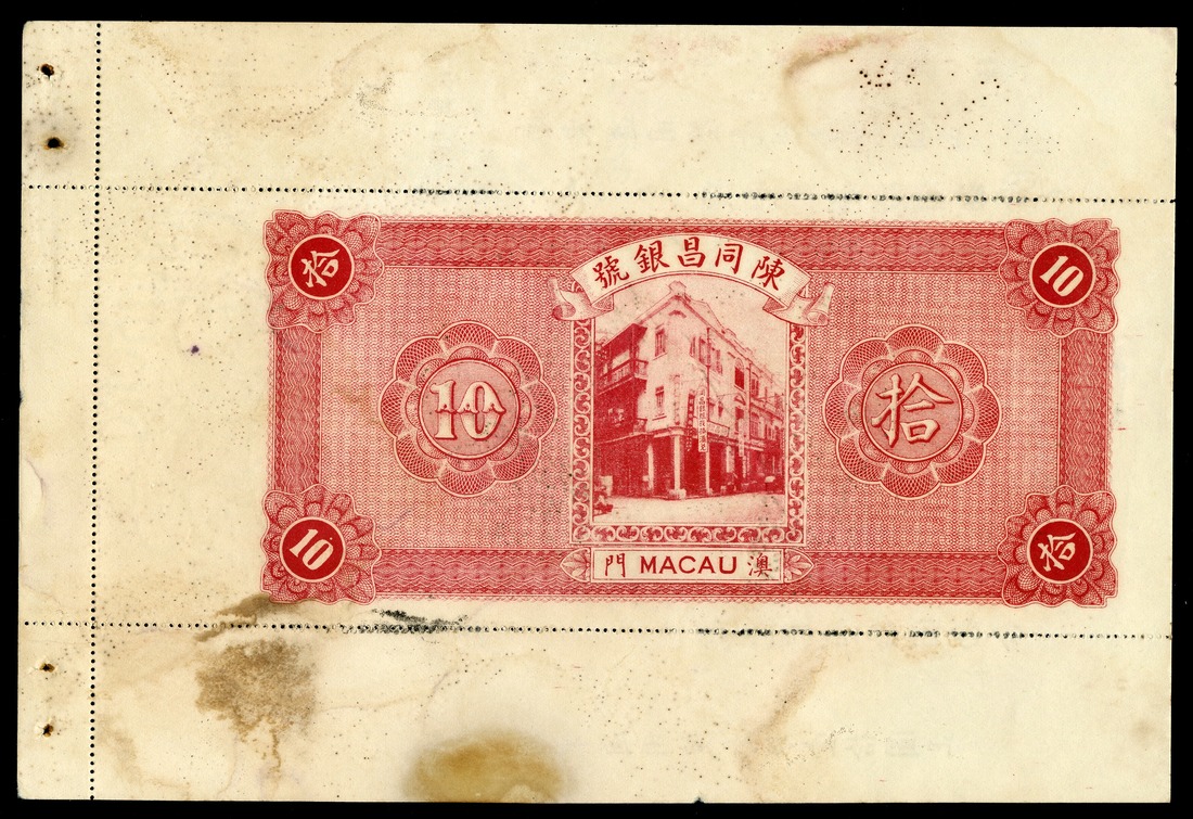Macao. Chan Tung Cheng Bank. 10 Dollars. P-S92r. Remainder note with attached counterfoil at top and left and right. Red back, bank building at center. Staple holes left and right foil, with typical staining on foils. Extremely Fine.