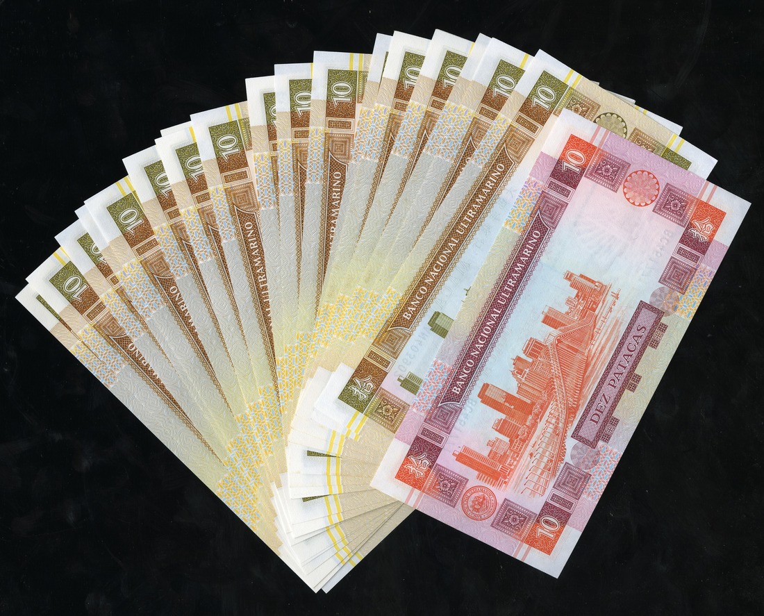 Macau. Banco Nacional Ultramarino. Lot of 10 Patacas. 1991. P-65a. Building at right, bridge and cityview on back. Sequential number groupings; also 10 Patacas. 2001. P-76a. All Crisp Uncirculated. [42]