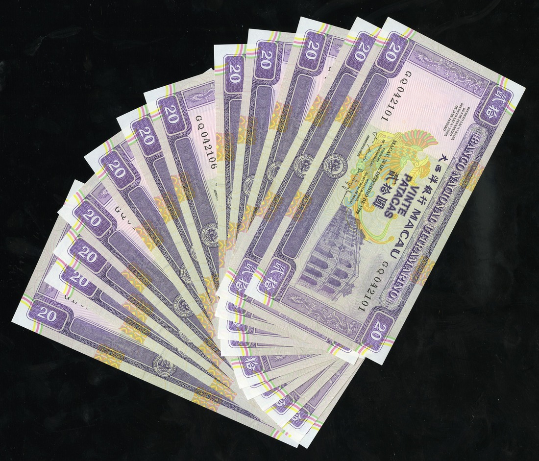 Macau. Banco Nacional Ultramarino. Lot of 20 Patacas. 1999. P-71a. BNU building at right, bridge and cityview on back. 10 in sequential numbers. Crisp Uncirculated. [12]