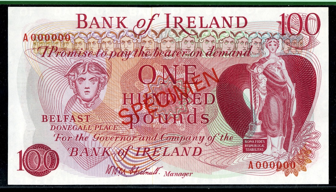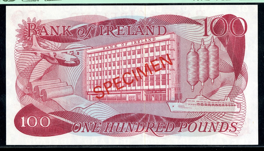 Northern Ireland. Bank of Ireland, Belfast. 100 Pounds. ND (1971). SPECIMEN. P-64s. Head of Mercury, woman with harp at right; airplane, bank building, ship, spools on back. PCGS Gem New 66 PPQ.