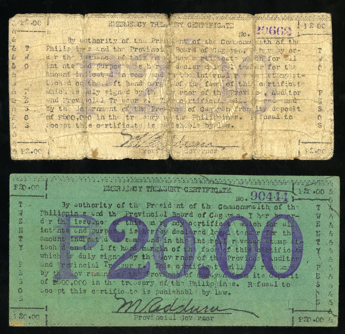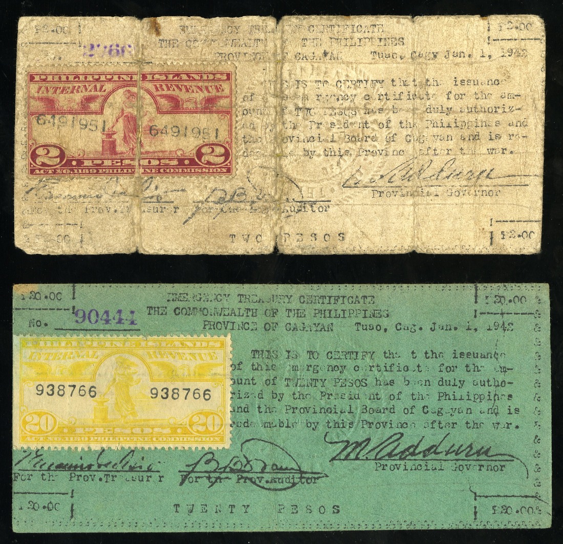 Philippines. WWII Emergency currency. Cagayan. Currency Board. Pair: 20 Pesos. 1942. P-170a. Orange-yellow Philippine Internal Revenue stamp. VF-EF; and 2 Pesos. 1942. Red I.R. stamp on white paper. VG. [2]