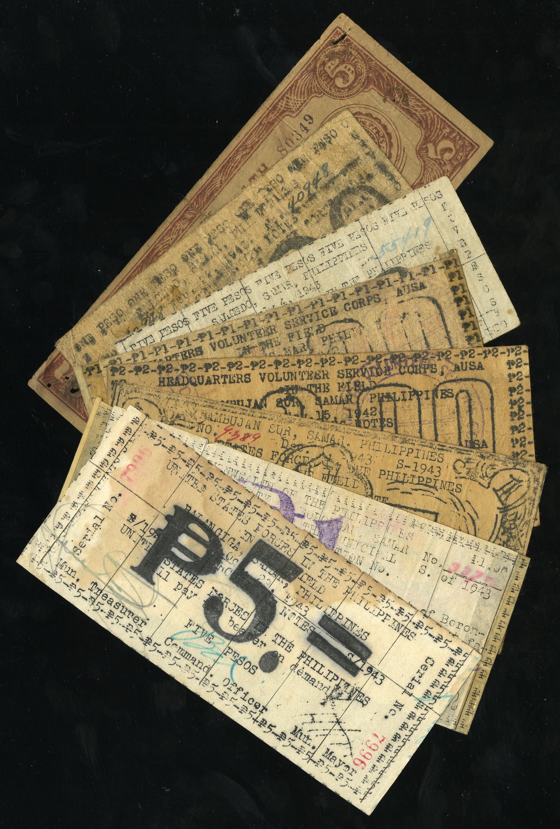Philippines. Small group of better WWII Emergency & Guerrilla currency. Samar. Municipal and U.S. Force issues: Balagiga. 5 Pesos. 1943; Borongan. 1 Peso (ends have been taped); Pambujan Sur. HQ Volunteer Service Corps. 1 and 2 Pesos. 1942; US Forces 1 Peso. 1943; Salcedo. 1 Peso (2) and 5 Pesos. 1942, 1943; and Leyte. Leyte Currency Board. 5 Pesos. 1943. Staple holes at end. (P-S408). Average VG-Fine, with some better, two with contemporary tape backing at ends. [9]