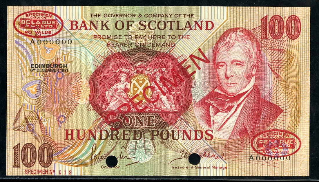 Scotland. The Bank of Scotland. 100 Pounds. 1971. SPECIMEN. P-115s. Red on multicolor underprint, Arms at center flanked by two women, portrait of Sir W. Scott at right; building back center. De la Rue Specimen ovals in red, SPECIMEN in red. PCGS 64 Very Choice New Hole Punch Cancelled, Minor Mounting Remnants on Back at Right.