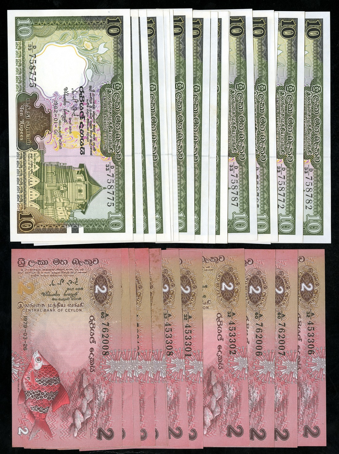 Sri Lanka. Central Bank of Ceylon. Grouping: 2 Rupees. 1979 (12). P-83. Fish; butterfly and lizard on back; 10 Rupees. 1982 (17). P-92a. Kandy's Temple of the Tooth; vertical depiction of shrine. Uncirculated. [29]
