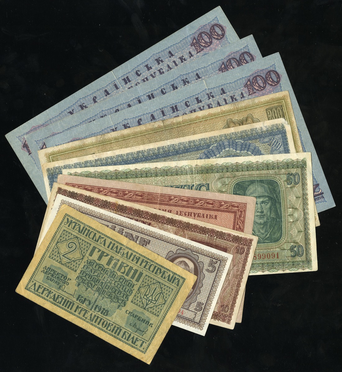 Ukraine. Small assortment: State Credit Notes. 1918 - 2 and 10 Hryven; 100 Hryven (3). Farmer and wife. P-20b, 21a, 22a; WWI. German Occupation. Zentralnotenbank. 5, 10, 50, 100 and 200 Karbowanez. P-51, 52. 54-56. Generally F-VF, the last tape remnants on back, also on one of the 100 Hryven. [10]
