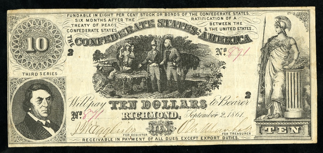 CSA. T-30 $10 1861 PF-5. No. 871. Very Fine. Some pinholes.