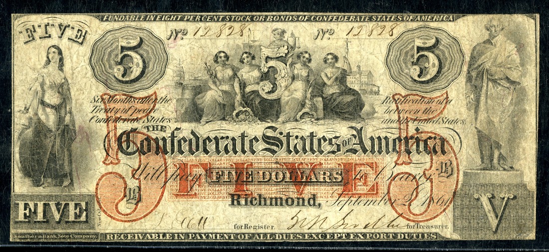 CSA T-31 $5 1861 PF-1. No. 12828. Plate B. PCGS Fine 15 Apparent Minor Repairs.