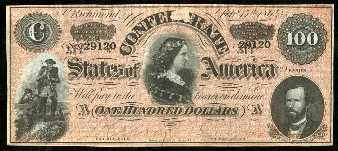 PF-3, Cr.494. Lucy Pickens. "SERIES II." Nos.29120. A-D. The A note has a printing void where the "D" and "E" in "CONFEDERATE" are incomplete. Caused by an obstruction. [4]
