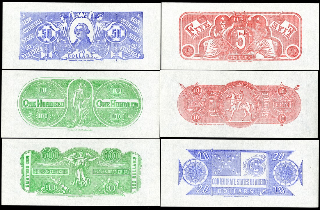 CSA: Set of Chemicograph Backs Intended for Confederate Currency. Set of six Chemicographs backs with designs intended for the Feb. 17, 1864 Confederate issue of the $5, $10, $20, $50, $100 and $500 denominations. Chemicograph plates were ordered by the Treasury Department of the CSA from S. Straker and Sons, engravers, London. They were shipped out from there in January 1864 but all disappeared. Further shipments, meanwhile, were all stopped by Union blockades. Examples of the plates were located some 75 years later and a limited number of sets of prints were struck from them. These prints here are from this small group. Because of their historical importance, the plates were then donated to the Smithsonian Institute. The set is accompanied by a reprint of Philip Chase's March-April 1950 Numismatist article on the Chemicographs and an information sheet. The backs grade Choice About Uncirculated to Uncirculated. In the original 1959 SDC Packet envelope (which has some tears, backflap etc). [Set of 6]