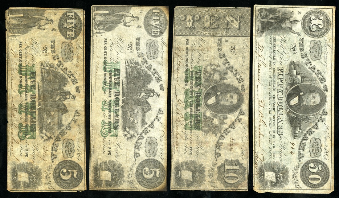 AL. Civil War Issues. State of Alabama. 1-4) $1. 1863. (Cr-1). VG, Fine, Fine with tear, and AU; 5-6) $5. 1864. (Cr-15). VG and About Fine with foxed corners; 7) $10. 1864. (Cr-14). About Fine; 8) $50. 1864. (Cr-13). Fine; 9) 25 Cents 1863. (Cr-6A). AU; 10) 50 Cents. 1863. (Cr-3). AU. [10]