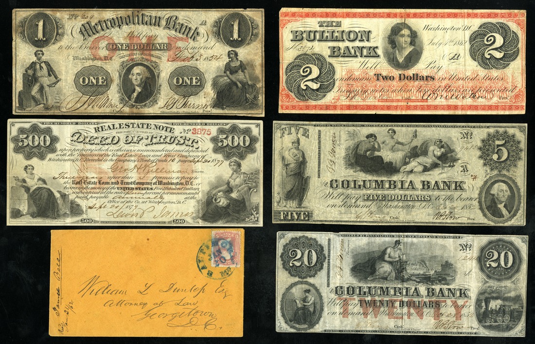 DC. Small District of Columbia Group. The Bullion Bank. 1) $2. July 4 1862. (DC-170-G22a). VF; Columbia Bank. 2) $5. Oct. 20 1852. (DC-195-G6). Fine, pinholes; 3) $20. Oct. 28 1852 (-G10a). VF; Metropolitan Bank. 4) $1. Feb. 3 1854. (DC-295-G2e). Fine, age toning; Real Estate Loan and Trust Company. 5) $500. Sept. 20 1877. Female figure either side. VF. Accompanied by an 1862 franked envelop sent to Georgetown address. [5]