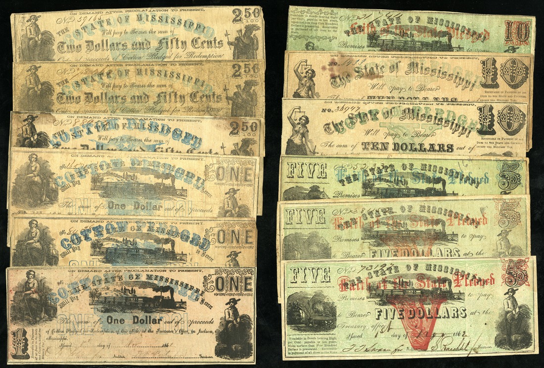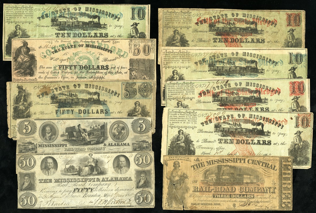 MS. Civil War Issues. State of Mississippi. 1-3) $1. 1862. (Cr-25B, 28); 4-6) $2.50. 1862. (Cr-24, 27); 7-9). $5. 1862 (Cr-31, 36, 41); 10-11) $10. 1862. (Cr-17, 17A); 12-17. (Cr-30, 35, 40); 18) $50. 1862. (Cr-15); 19) $50. 1862. (Cr-38). Fine details, hole; also Railroad notes: Mississippi Central Railroad Co. 20) $3. 1862. VG, torn; Mississippi & Alabama Railroad Company. 21) $5. 1838; 22) $50. 1837. Nearly all Fine, a few with stains, two VG, a few higher. [22]
