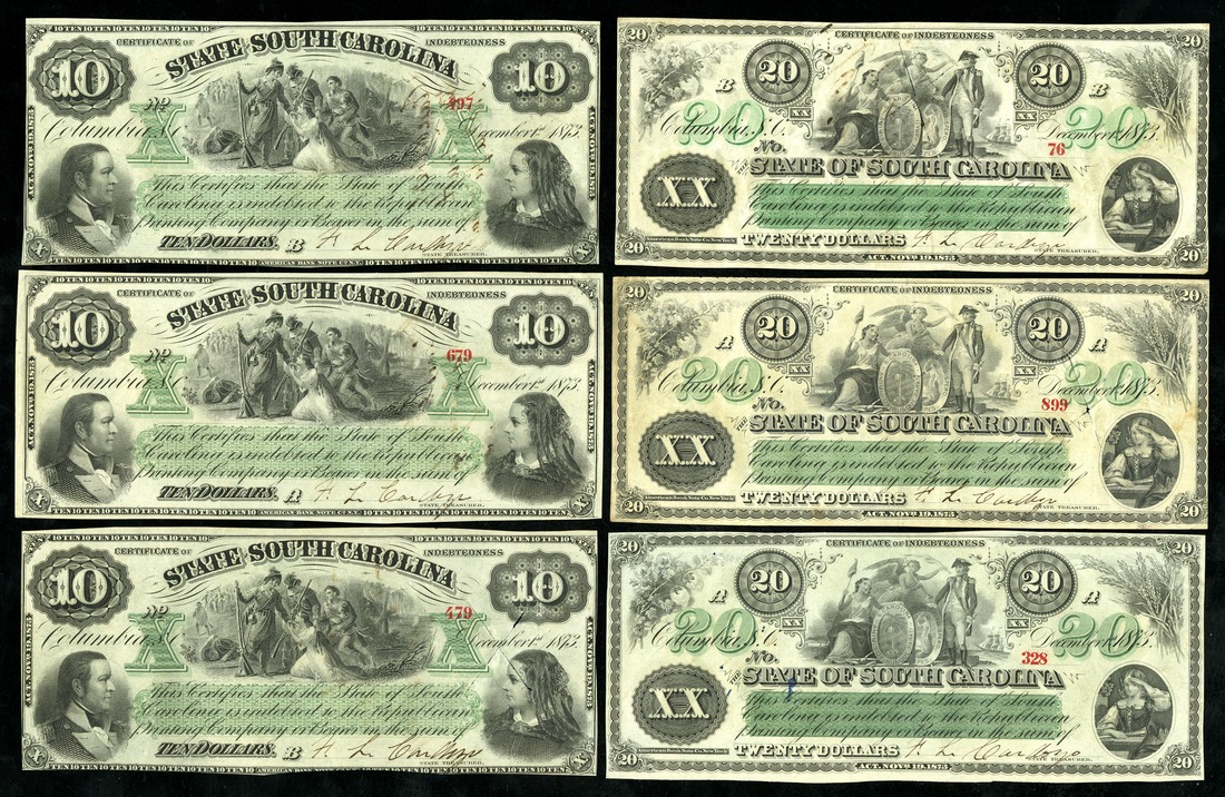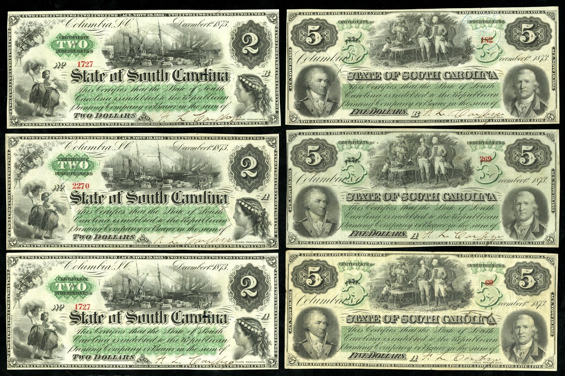 SC. Nice assortment of State of South Carolina, Columbia 1873 issues. 1) $1. (Cr-13). Unc., cut canceled; 2-4) $2. Two Plate A, one plate B (Cr-14). Unc., cut canceled; 5-7) $5. (Cr-15). VF, pen canceled; EF and AU, cut canceled; 8-10) $ 10. (Cr-16). AU, pinholes; AU, cut canceled; Unc.; 11-13) $20. (Cr-17). Two VF, cut canceled; the other Unc.; 14) $50. (Cr-8). EF-AU. [14]