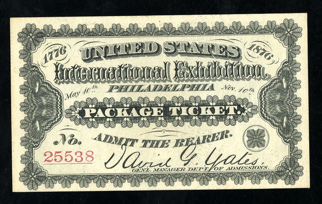 Pleasing of 1876 Philadelphia Centennial Exposition Tickets. Two with blue serial numbers. "Package Ticket." Indian Princess and eagle on red tinted back. Uncirculated. [13 pieces]