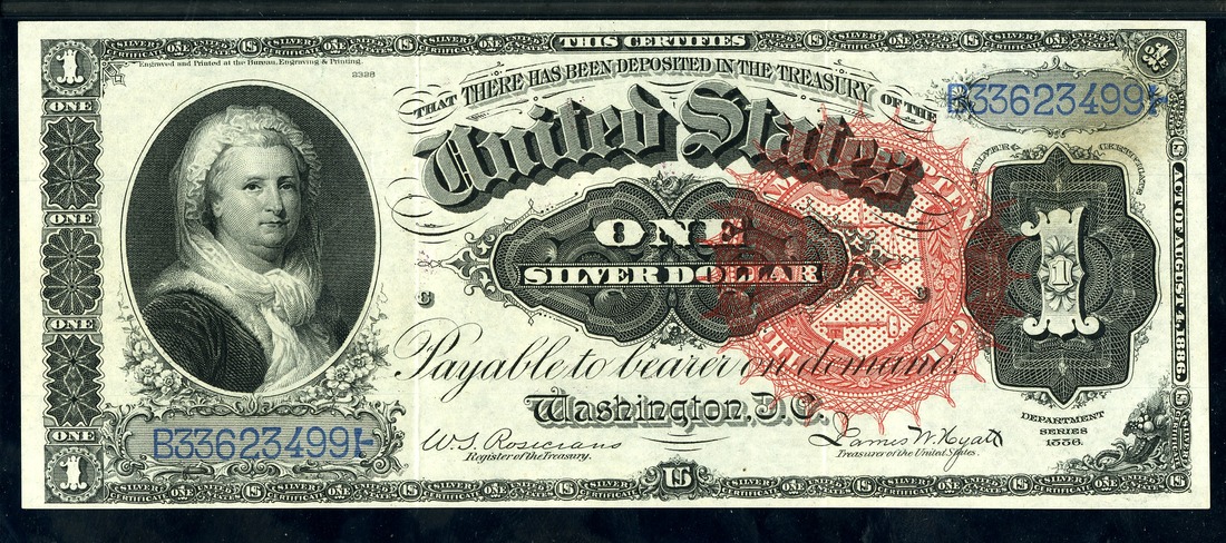 Fr. 217. $1. 1886 Silver Certificate. Martha Washington. Rosencrans-Hyatt, large red seal. No.B33623499. C. PMG About Uncirculated 50. STAIN.