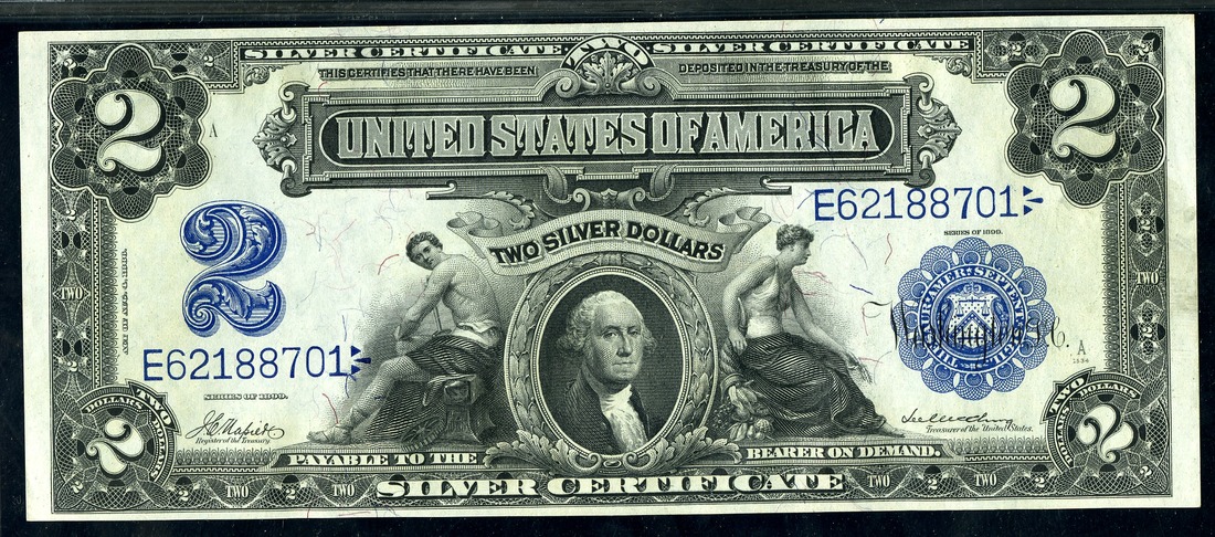 Fr. 253. $2. 1899 Silver Certificate. George Washington. Napier-McClung. No.E62188701. A. From an original bank wrapped pack of twenty-five consecutive notes. PMG 55 Choice About Uncircuated EPQ.