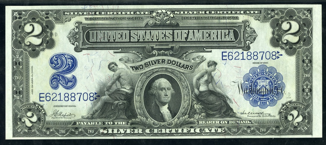 Fr. 253. $2. 1899 Silver Certificate. George Washington. Napier-McClung. No.E62188708. D. From an original bank wrapped pack of twenty-five consecutive notes. PMG Gem Uncirculated 65 EPQ.