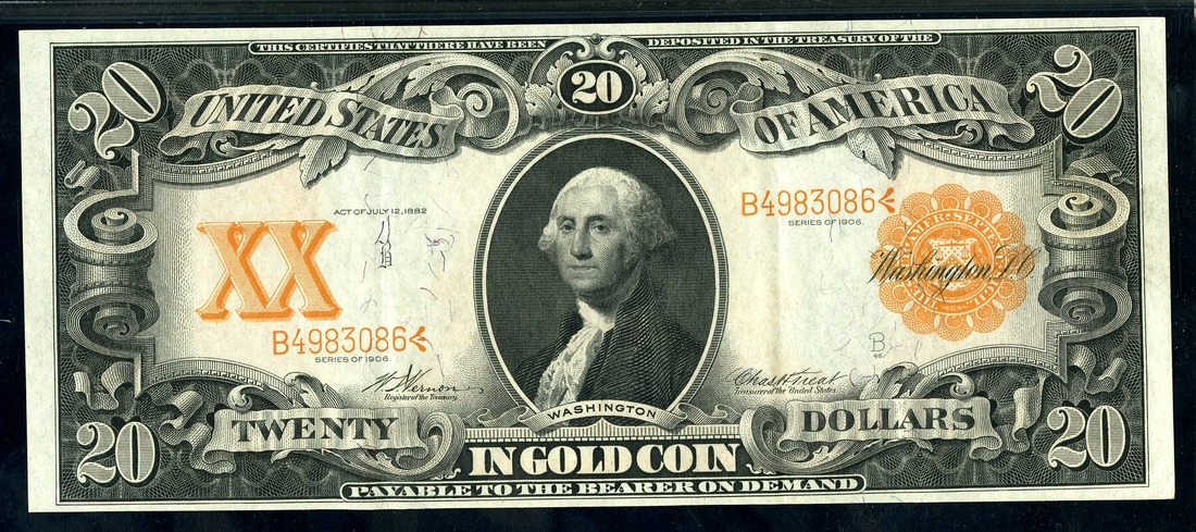 Fr. 1181. $20. 1906 Gold Certificate. George Washington. Vernon-Treat. No.B4983086. B. PMG Choice Extremely Fine 45 EPQ. Fresh and bright. Rarely seen original color. First of two consecutive examples.
